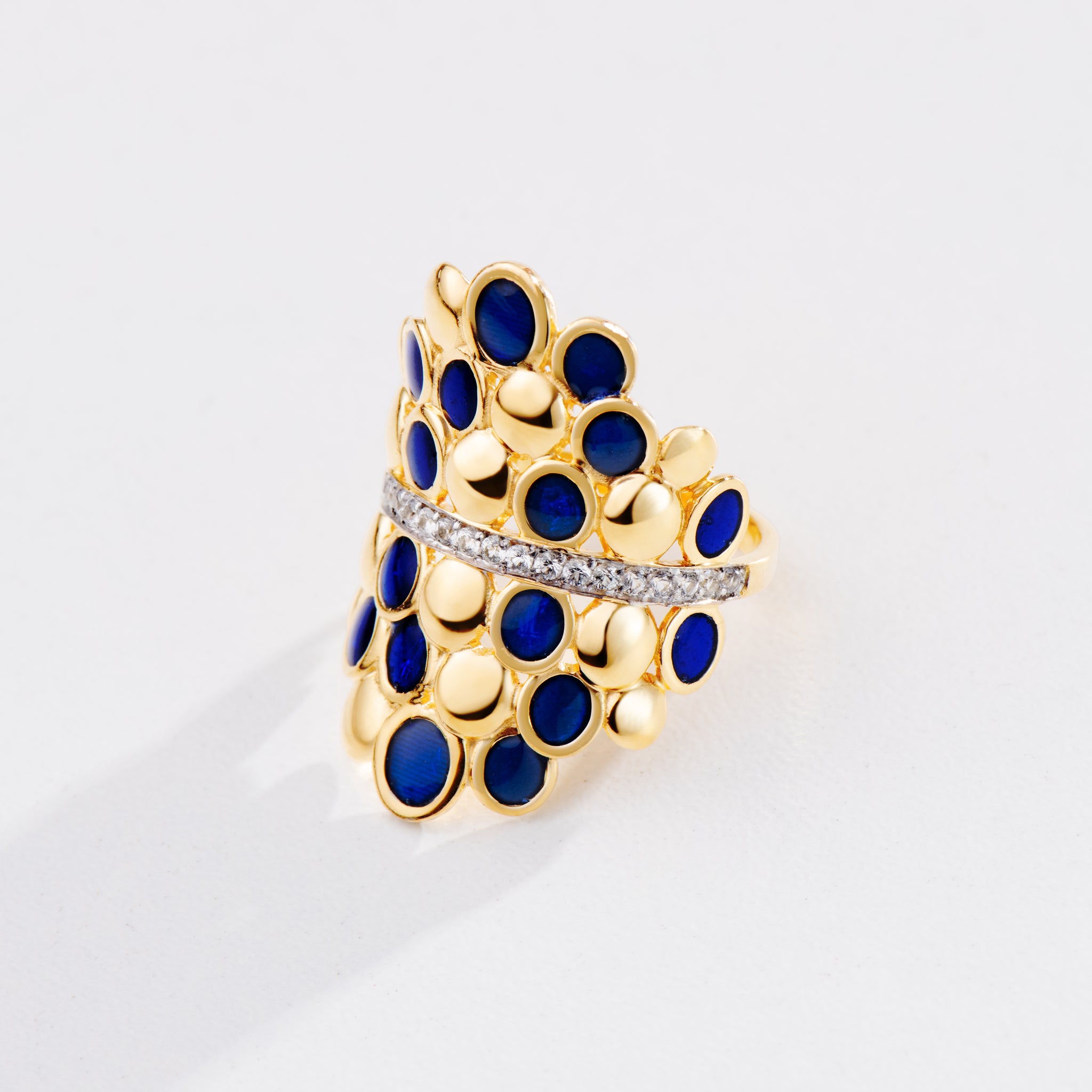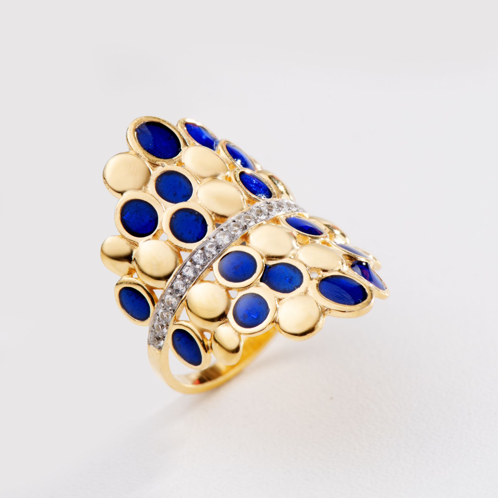 Anel em Prata banhado a Ouro 18k esmaltado em Azul com safira incolor 0,26ct.
